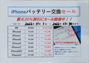 11/1~11/30まで、「iPhoneバッテリー交換セール」を開催中です。