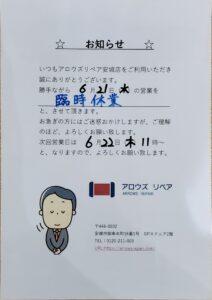 6/21(水)臨時休業のお知らせ 2023/06/19 お知らせ 臨時休業 いつも当店をご利用いただき誠にありがとうございます。 6/21(水)は、スッタフ研修の為、臨時休業とさせて頂きます。 ご迷惑をお掛けしますが、宜しくお願い致します。