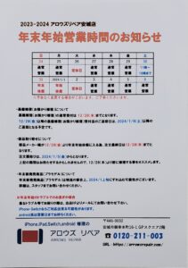 12/29(金)以降の受付修理品は、ご返却が1/6(土)以降になりますので、ご了承くださいませ。