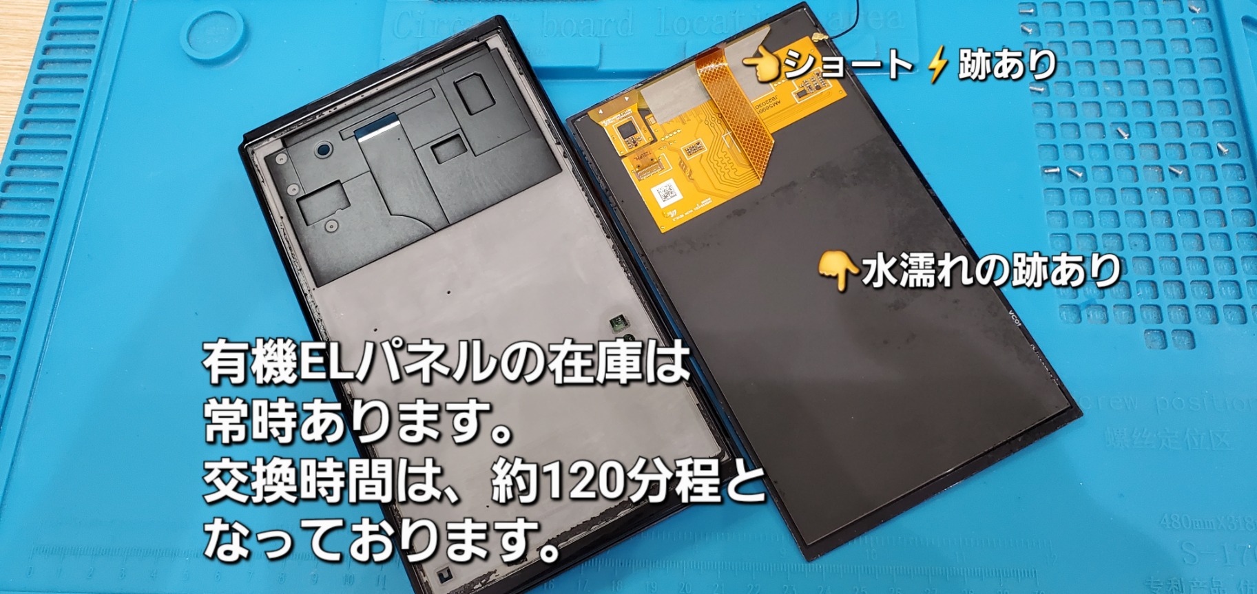 今回は、有機ELディスプレイの配線部のショートとバッテリーの緑青(サビ)があり、両方ともに交換が必要でした。