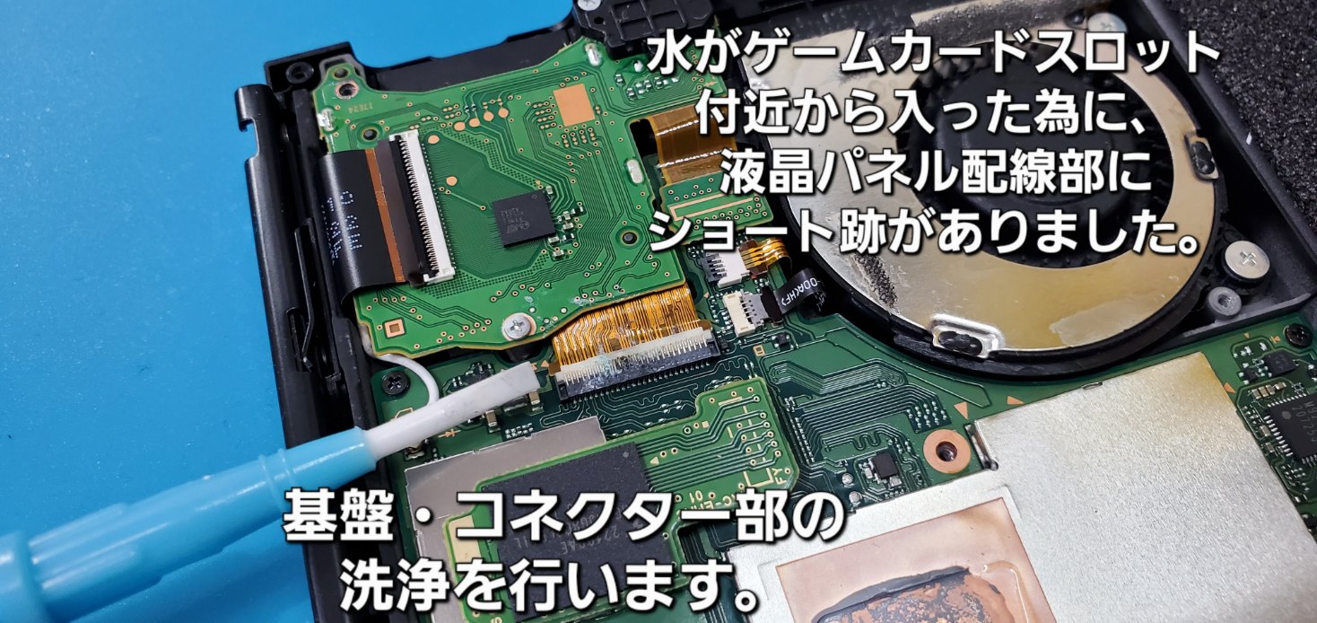 内部を確認したところ、ゲームカードスロット部より少量ですが、水が浸入し液晶コネクター部でショートした形跡がありました😥