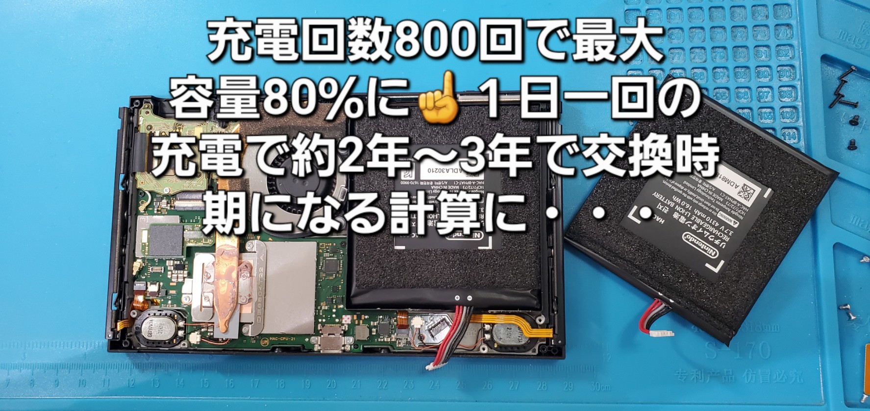 Switchのバッテリーは、約800回の充電を行うと、最大容量が80%になり、交換の目安となるそうです。
