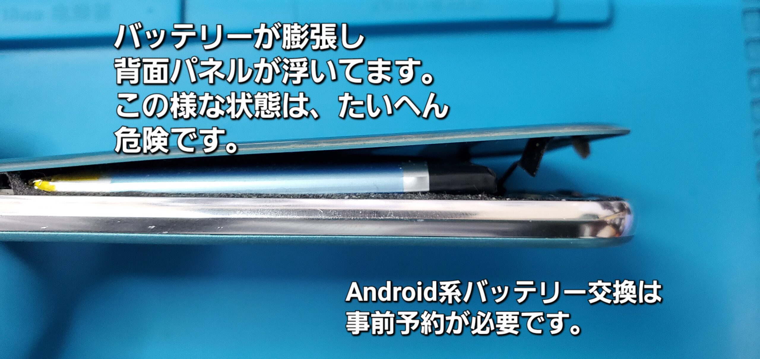 受付時の無料診断でも、動作等に問題ありませんでしたが、背面パネルが浮き上がっており、バッテリーが膨張しておりましたので、早速交換修理実施致しました。(事前予約あり)