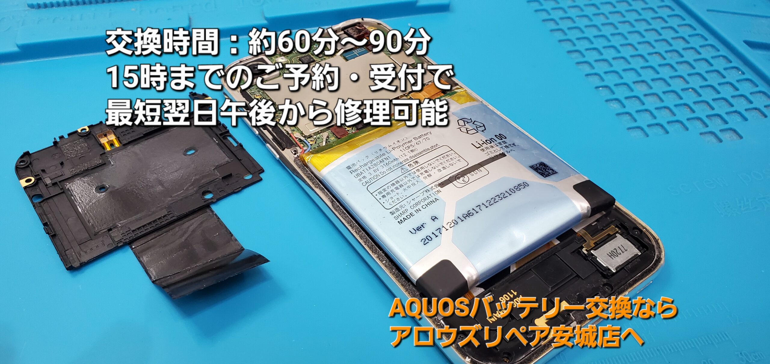 今回のAQUOS R バッテリー交換作業時間は、約60分~90分で完了致しました。